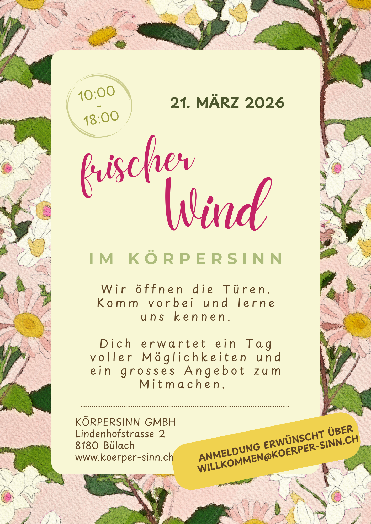 Im Körpersinn finden jede Woche vor Ort verschiedene Gruppenlektionen statt, siehe auch Stundenplan. Es gibt natürlich auch die Möglichkeit online mitzumachen, falls der Weg mal zu weit oder du grad unterwegs sein solltest. Möchtest du gerne dabei sein? Nimm mit mir Kontakt auf und melde dich am besten noch heute für deinen persönlichen „Kennenlerntermin“ an.