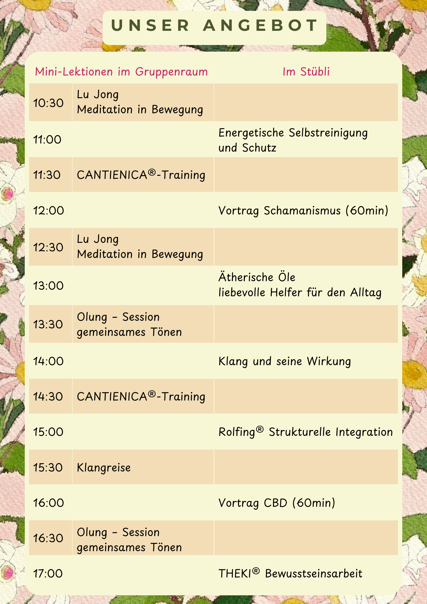 Ob CANTIENICA® – Training oder LU JONG® Tibetisches Yoga, Dein Trainingsabo ist zu jeder Zeit an jeder Location gültig. Siehe die neuen Trainings- und Öffnungszeiten.